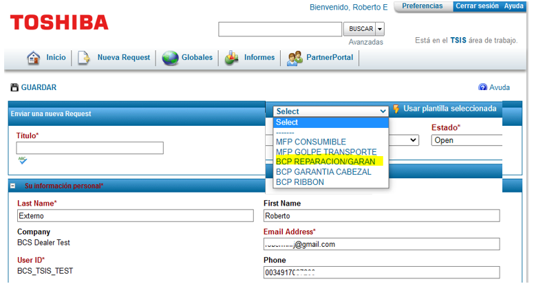 2. En el desplegable selecciona la plantilla BCP REPARACION/GARAN y pulsa posteriormente sobre “Usar plantilla seleccionada” para que se rellenen varios campos automáticamente (por ejemplo, tus datos de usuario y la categoría de producto “Barcode Printers” entre otros).