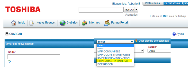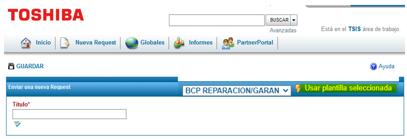 1. Para solicitar la evaluación en garantía de un cabezal, abre una nueva request, selecciona la plantilla BCP GARANTÍA CABEZAL y pulsa sobre “Usar plantilla seleccionada