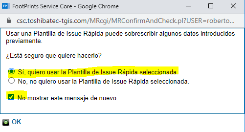 5. Una vez elegido, pulsa sobre “OK” y en la pantalla inicial sobre guardar. La incidencia se crea en el servidor de FootPrints y se gestiona desde nuestro soporte técnico.