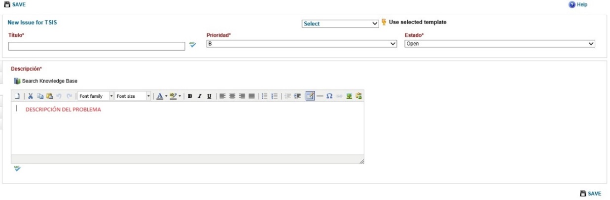 7. Por último, pulsa sobre el botón “SAVE” y tu Issue quedará grabada en el sistema. El sistema nos enviará en ese momento, un e-mail con la incidencia.