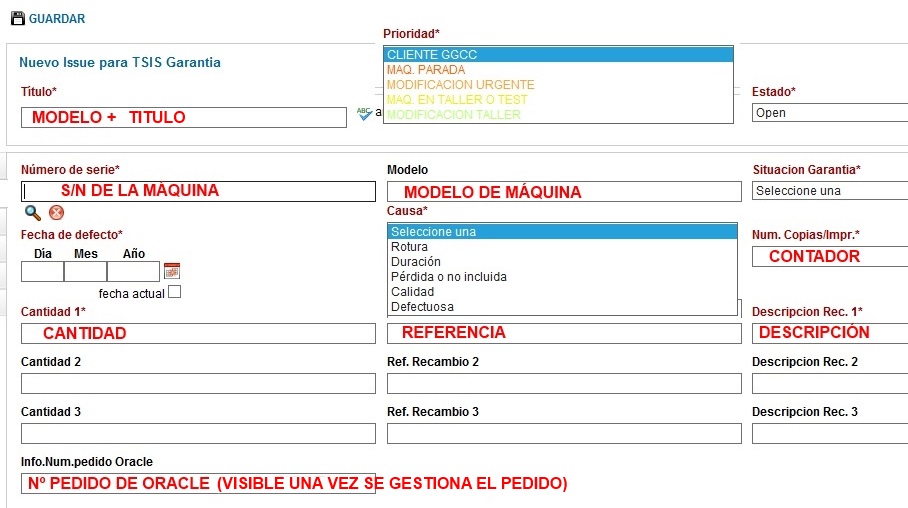 Si necesitamos más de tres piezas para la reparación procederemos a abrir otra garantía para la misma máquina.