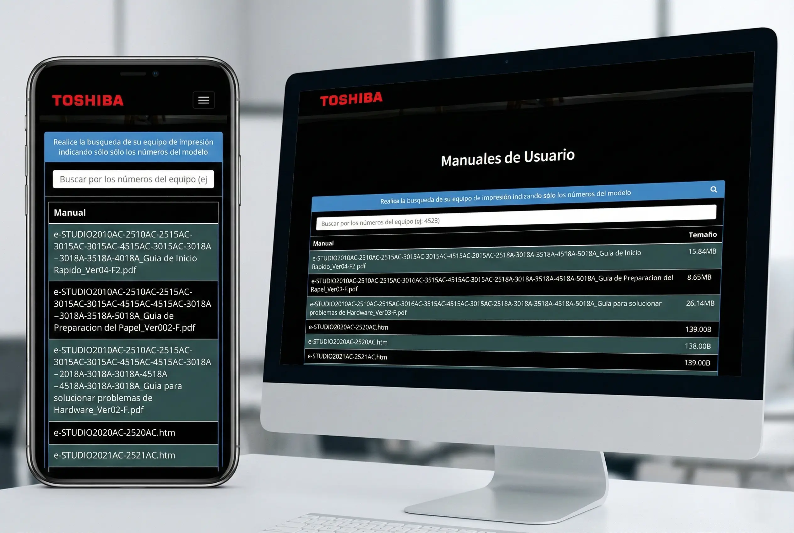 - Búsqueda Rápida e Inteligente: El sistema permite localizar cualquier manual filtrando simplemente por el número del modelo (ej: introduciendo "4518" para la serie e-STUDIO4518A), agilizando el proceso.