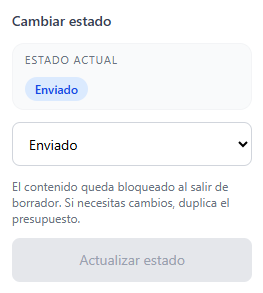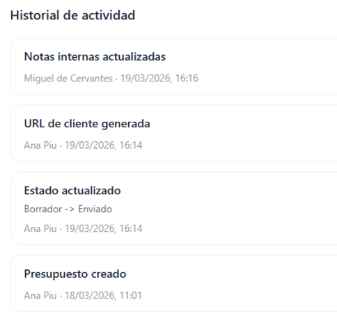 Esta información no es visible para el cliente, pero permite mantener mejor organizado el seguimiento comercial y conservar oportunidades incluso en presupuestos marcados como perdidos.