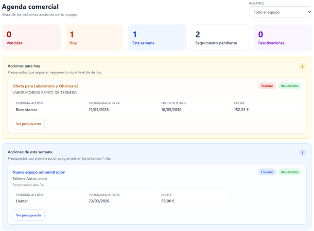Permite al comercial y al supervisor priorizar mejor su trabajo y consultar el contexto de cada presupuesto de forma mucho más ágil.