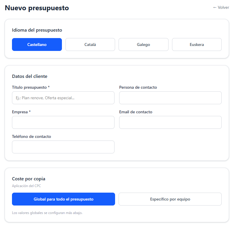 NOTA: El modo CPC global y el modo CPC por equipo son excluyentes. Si eliges el segundo, cada máquina mostrará sus campos de Color, Monocromo y Low-color.