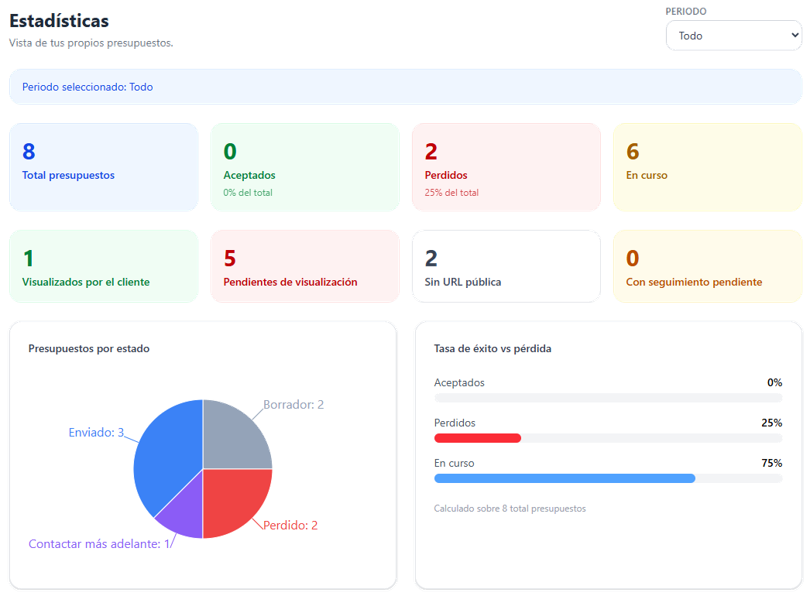 Cada usuario accede a una estadística adaptada a su rol: el comercial ve sus propios presupuestos, el supervisor los suyos y los de su equipo.