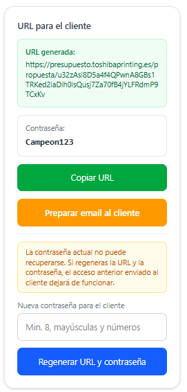 La propuesta se comparte mediante una URL pública protegida por contraseña. Desde la misma ficha se puede copiar la URL o preparar un email al cliente.