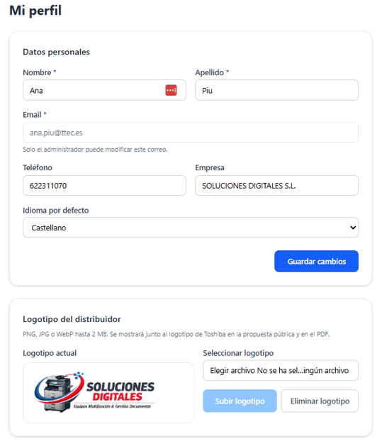 Y por supuesto, puedes añadir el logo de tu empresa que aparecerá en los presupuestos (tanto URL como PDF).