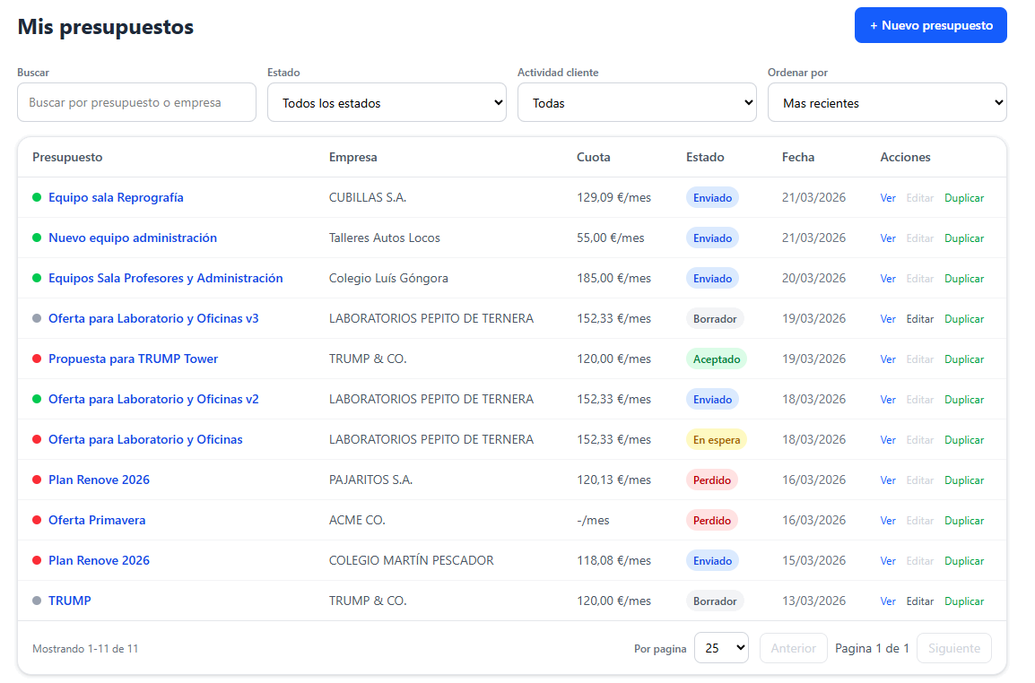 Permite crear presupuestos, compartirlos con el cliente, descargar el PDF y hacer seguimiento de cada oportunidad con un estado claro.
