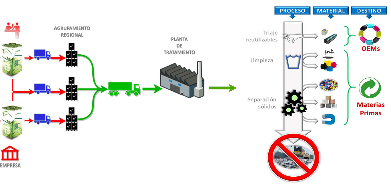 Este sistema se ha diseñado con la premisa de cero residuos a vertedero y para que tú, como Business Partner TOSHIBA puedas cumplir con tu responsabilidad medioambiental de forma sencilla y ágil, con la garantía de que todos tus consumibles desechados, de cualquier marca, serán reciclados con el mayor beneficio medioambiental, evitando que terminen en un vertedero.